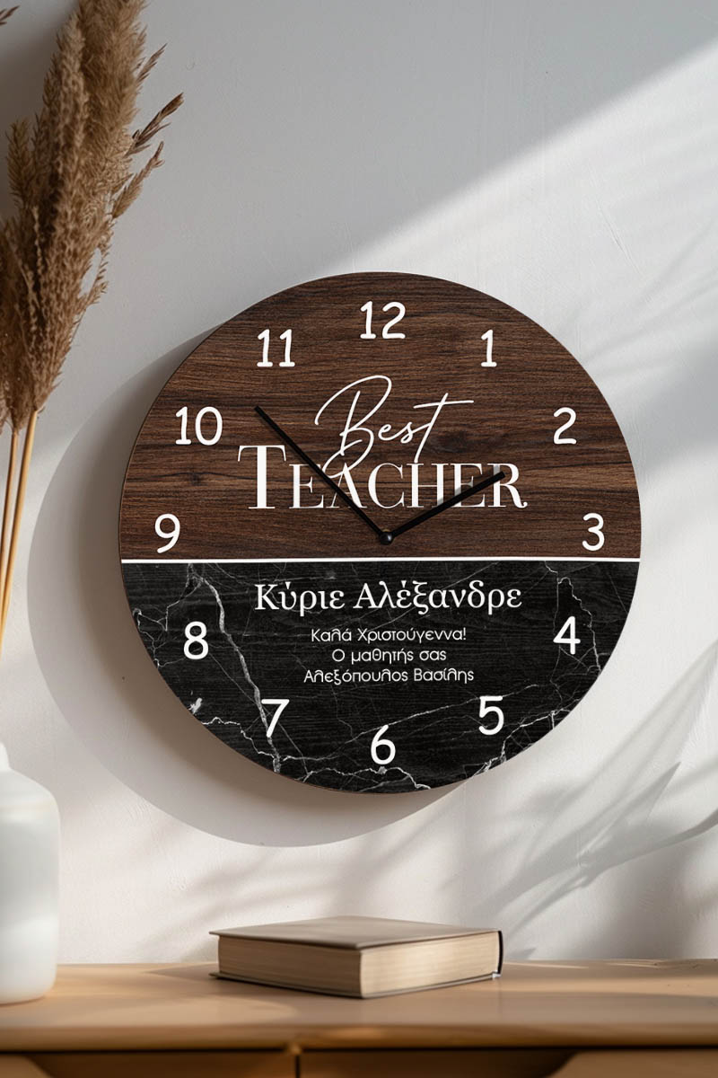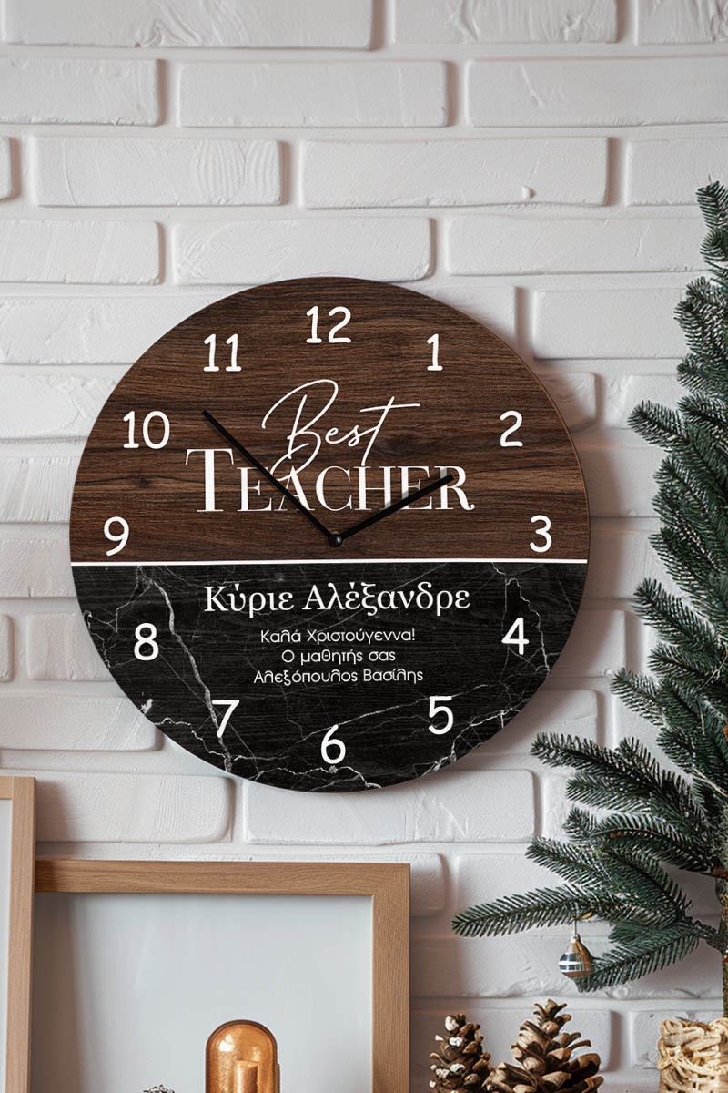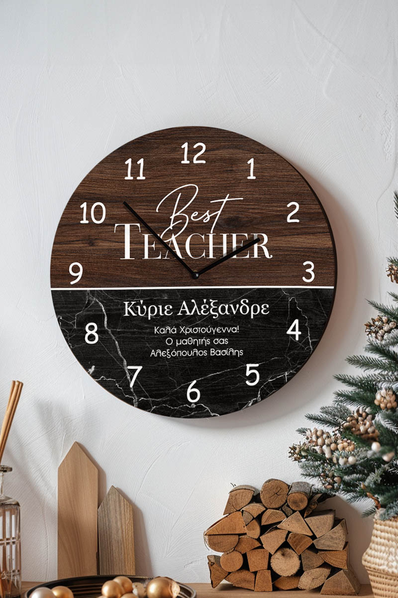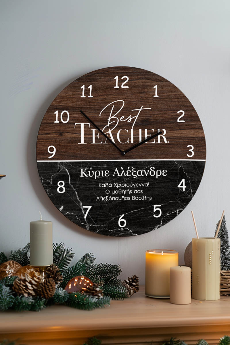 Χριστουγεννιάτικο Ρολόι Τοίχου Ξύλινο με Όνομα και Σχέδιο Μάρμαρο